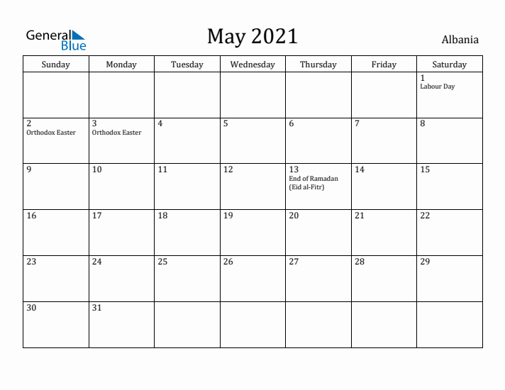 General Blue provides various types of calendars, from weekly, monthly, yearly, to calendars with holidays. All calendar templates are free to use, edit, print, or download. The free May 2021 Albania calendars can be downloaded in PDF, Word, or Excel formats. The Word and Excel calendars are editable calendars while the PDF calendar is for direct printing.