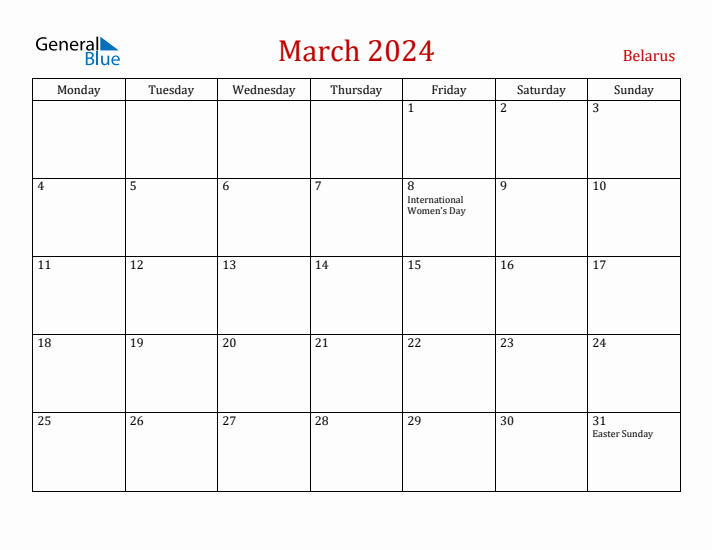Free downloadable March 2024 calendar with holidays for Belarus. This...