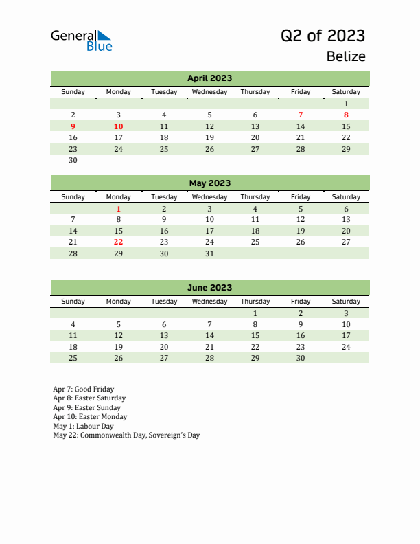 This page shows the 3 month calendar templates 2023 for Belize with holidays list in multiple styles. The Q2 2023 calendars in this page include the April, May, and June calendars in one downloadable and printable page. For quarterly calendars without holidays, see our Blank Quarterly Calendar.
