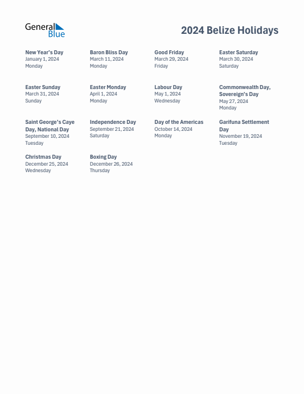 The free printable Belize 2024 holidays list is available in PDF, Word, or Excel format. The PDF format works best for those who like to print the list of holidays, while the MS Word and Excel holidays list 2024 can be easily modified or customized with notes, size or color changes. Download or print list of holidays now.