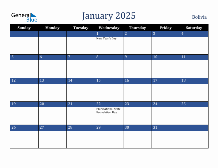 Free downloadable January 2025 calendar with holidays for Bolivia. This monthly calendar highlights the days of week in a stylish dark blue design. It's perfect for those who prefer a colorful calendar template or those who wants to view online calendar. This monthly holiday calendar's week starts on Sunday.