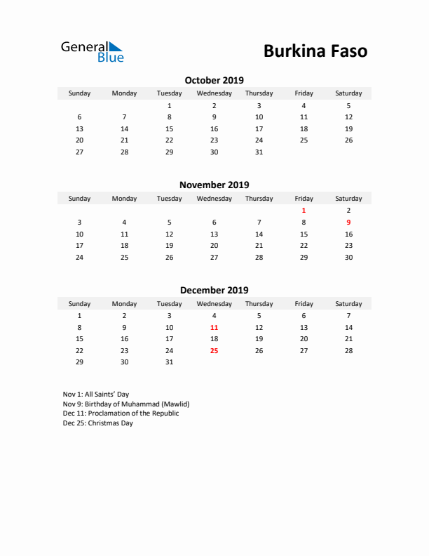 This page shows the 3 month calendar templates 2019 for Burkina Faso with holidays list in multiple styles. The Q4 2019 calendars in this page include the October, November, and December calendars in one downloadable and printable page. For quarterly calendars without holidays, see our Blank Quarterly Calendar.