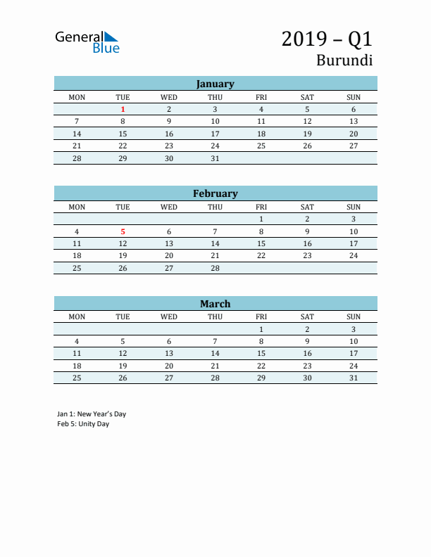 2019 Q1 Calendar with Holidays List for Burundi - Monday Start