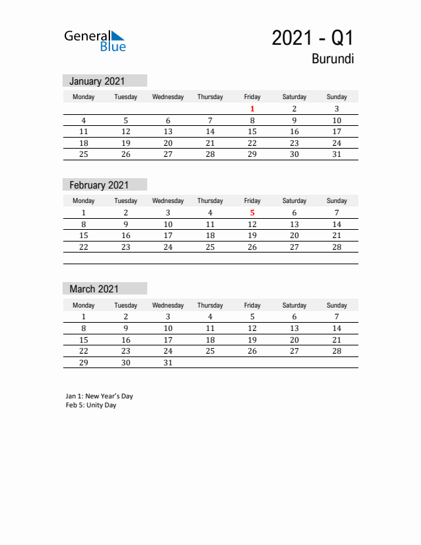 Q1 2021 Holiday Calendar for Burundi - Monday Start
