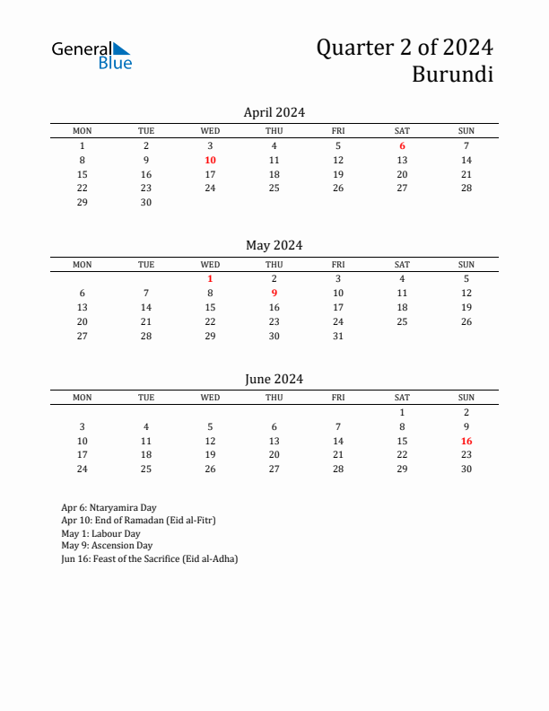 2024 Q2 Calendar with Holidays List for Burundi - Monday Start