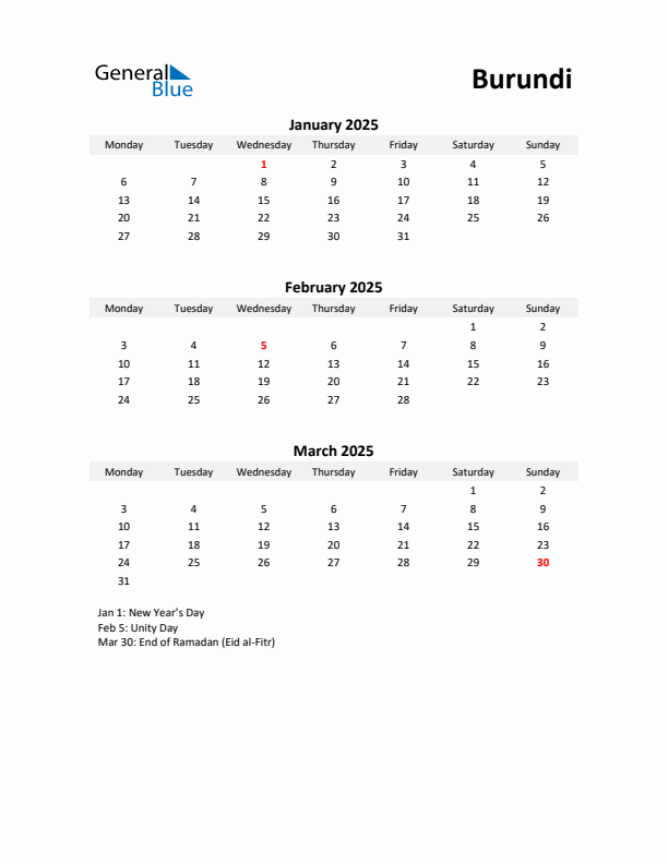 Q1 2025 Holiday Calendar for Burundi - Monday Start