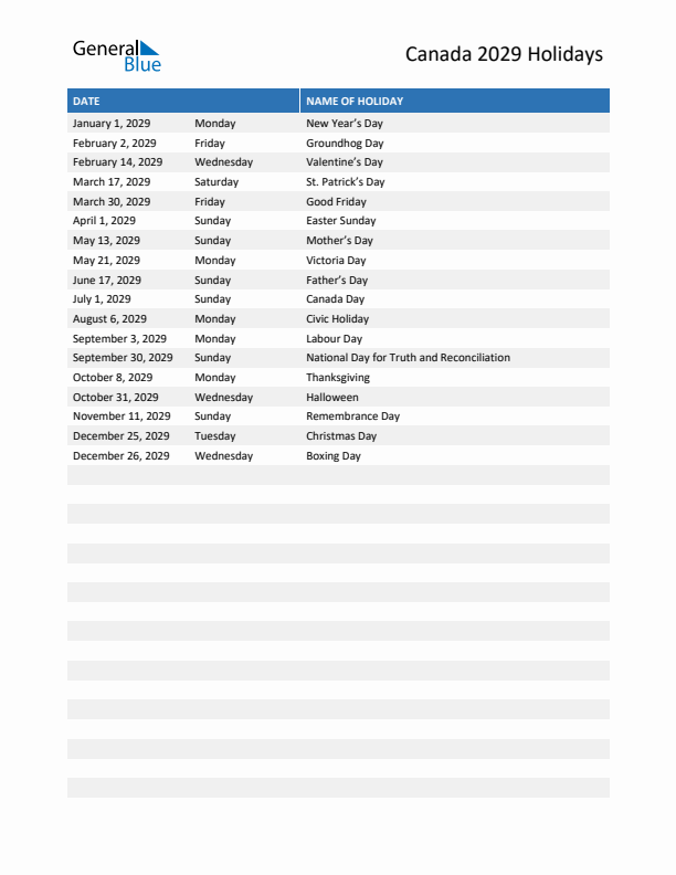 The free printable Canada 2029 holidays list is available in PDF, Word, or Excel format. The PDF format works best for those who like to print the list of holidays, while the MS Word and Excel holidays list 2029 can be easily modified or customized with notes, size or color changes. Download or print list of holidays now.