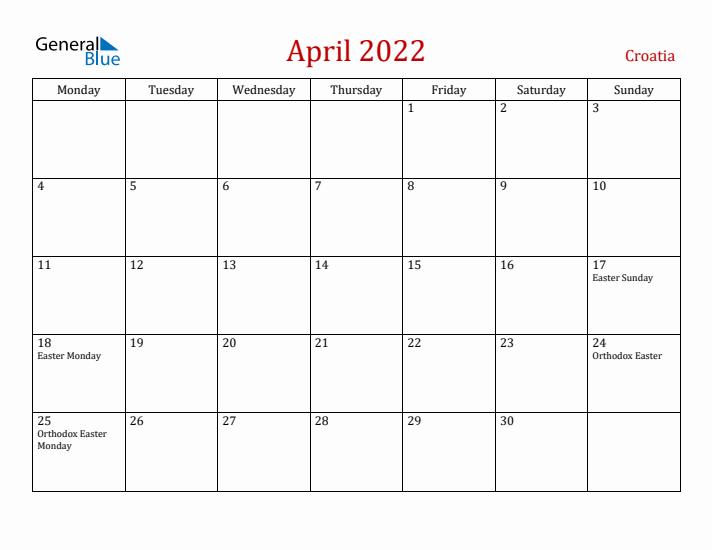 Croatia Monthly Calendar - April 2022 (Monday Start)