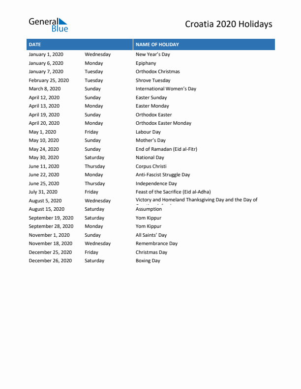 The free printable Croatia 2020 holidays list is available in PDF, Word, or Excel format. The PDF format works best for those who like to print the list of holidays, while the MS Word and Excel holidays list 2020 can be easily modified or customized with notes, size or color changes. Download or print list of holidays now.