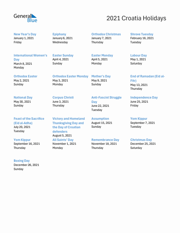 2021 Croatia List of Holidays