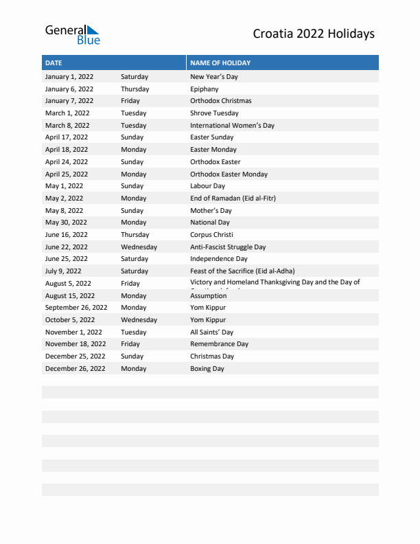 The free printable Croatia 2022 holidays list is available in PDF, Word, or Excel format. The PDF format works best for those who like to print the list of holidays, while the MS Word and Excel holidays list 2022 can be easily modified or customized with notes, size or color changes. Download or print list of holidays now.