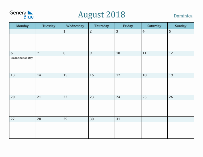 The free August 2018 holiday calendar for Dominica starts on Monday and is great for keeping track of any meeting or company events occurring within the month. You may change color schemes for this editable month calendar using the Word or Excel calendar to customize. Print-friendly version of this template is also available in PDF.