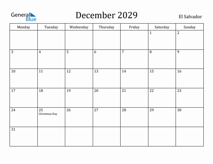 Editable December 2029 Calendar with El Salvador Holidays (Monday Start)