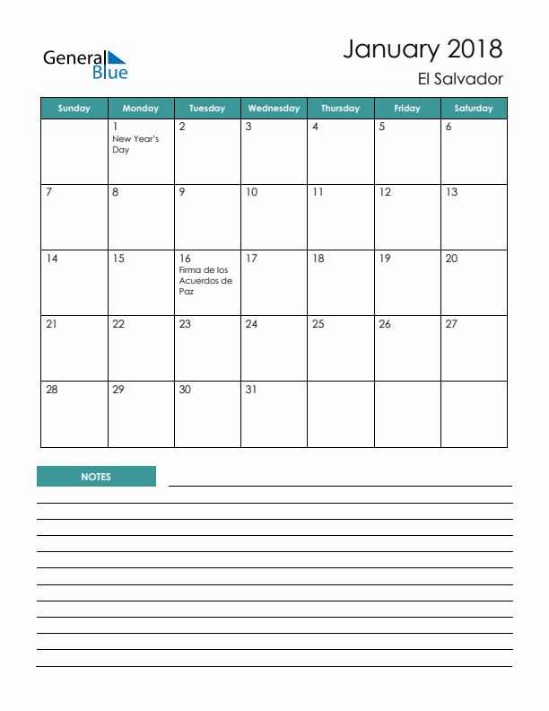 The January 2018 monthly calendar with notes section is a free printable calendar which allows you to plan your events or schedule for January 2018. The Sunday start calendar includes the holidays in El Salvador and it can be used as a monthly desk calendar since the notes section enables you to add reminders, to do lists, goals, and others.
