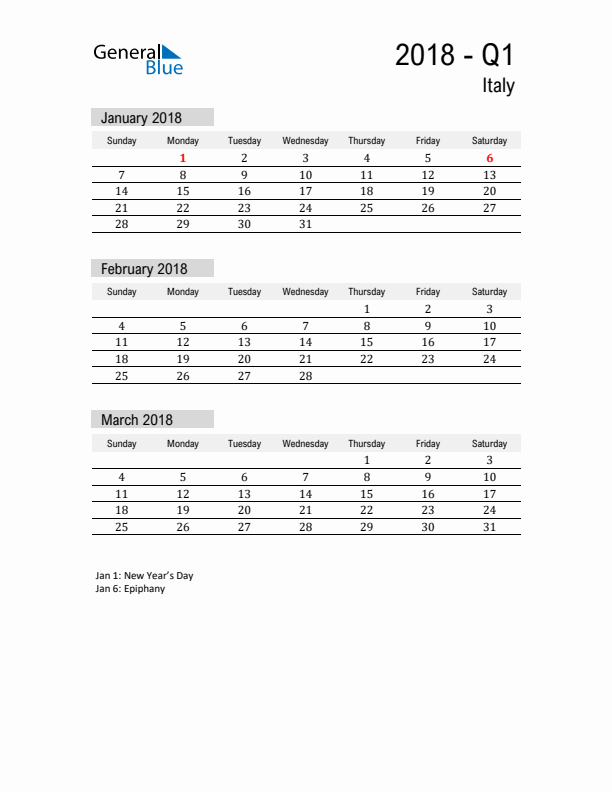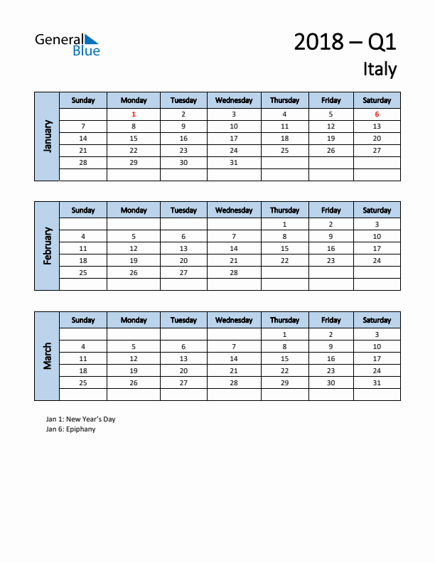 This page shows the 3 month calendar templates 2018 for Italy with holidays list in multiple styles. The Q1 2018 calendars in this page include the January, February, and March calendars in one downloadable and printable page. For quarterly calendars without holidays, see our Blank Quarterly Calendar.