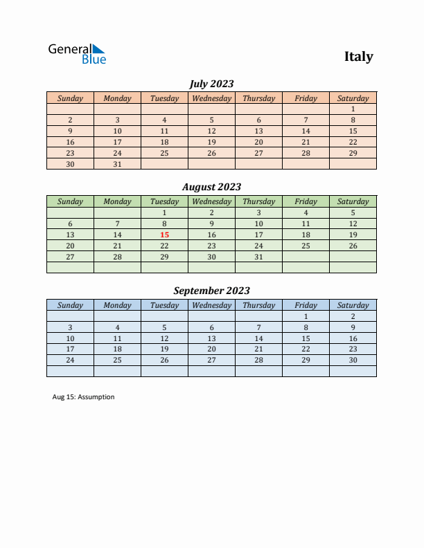 Italy Quarterly Calendar (Quarter 3 of 2023)