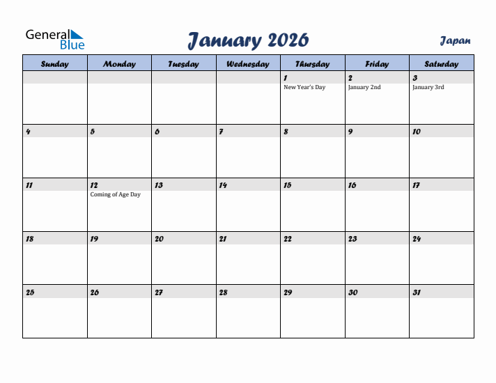 The Sunday start January 2026 calendar with holidays in Japan can help plan out your monthly events and schedule, while keeping track of the public holidays for the month of January.