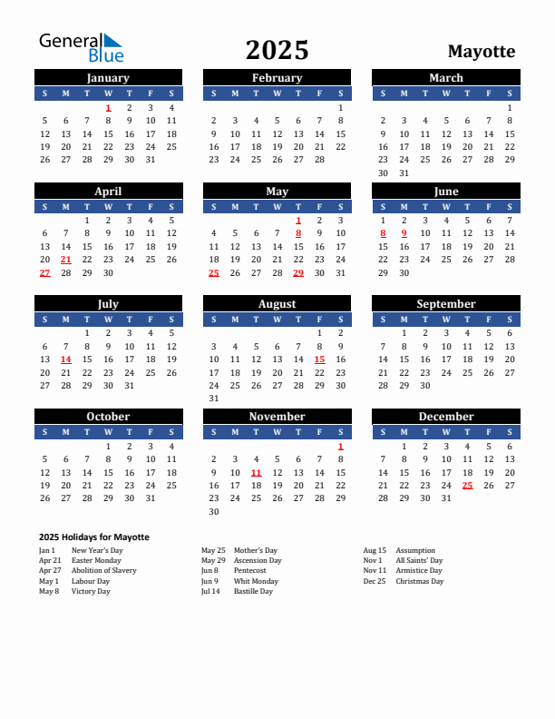 The Mayotte 2025 yearly calendars on this page starts on Sunday and it include list of holidays in Mayotte for year 2025. Multiple styles are available which are all free to download, print, edit, or customize. All one-page yearly calendars are based on Gregorian calendar.