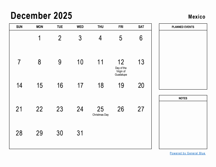 Free downloadable December 2025 calendar with holidays for Mexico. This...