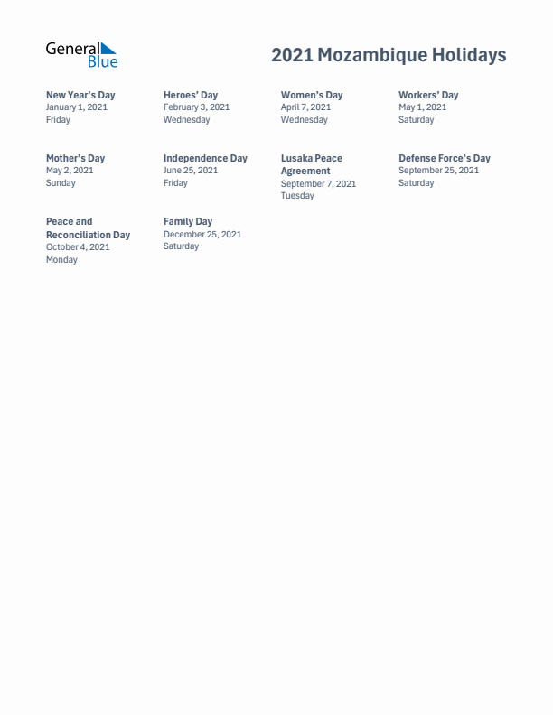 The free printable Mozambique 2021 holidays list is available in PDF, Word, or Excel format. The PDF format works best for those who like to print the list of holidays, while the MS Word and Excel holidays list 2021 can be easily modified or customized with notes, size or color changes. Download or print list of holidays now.
