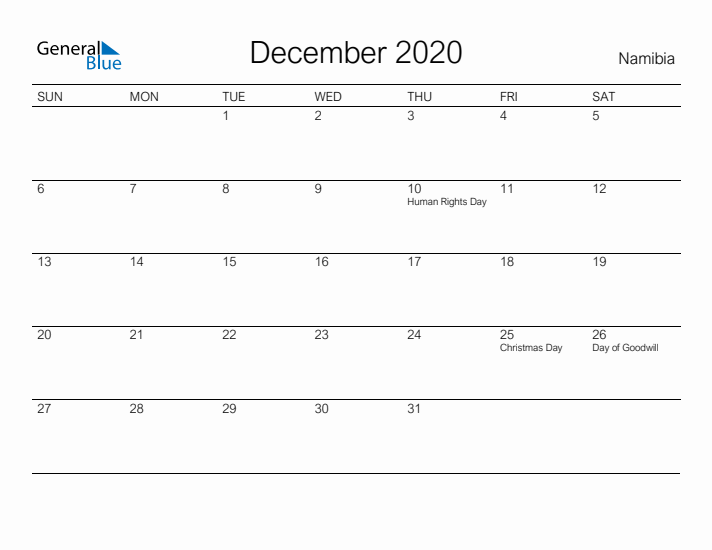 General Blue provides various types of calendars, from weekly, monthly, yearly, to calendars with holidays. All calendar templates are free to use, edit, print, or download. The free December 2020 Namibia calendars can be downloaded in PDF, Word, or Excel formats. The Word and Excel calendars are editable calendars while the PDF calendar is for direct printing.