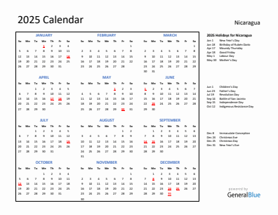 Current Year Calendar for Nicaragua with Holidays - 2025