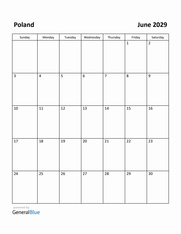 Free Monthly Calendar Template for June 2029 with Poland Holidays