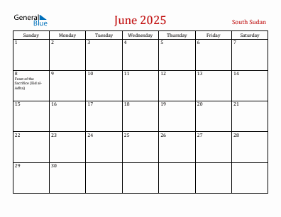 Current Year Calendar for South Sudan with Holidays - 2025