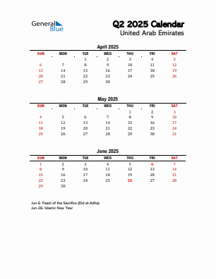 Quarterly Calendars with United Arab Emirates Holidays