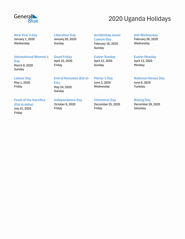 The free printable Uganda 2020 holidays list is available in PDF, Word, or Excel format. The PDF format works best for those who like to print the list of holidays, while the MS Word and Excel holidays list 2020 can be easily modified or customized with notes, size or color changes. Download or print list of holidays now.