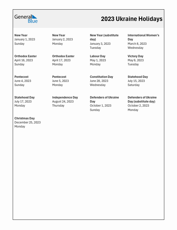 The free printable Ukraine 2023 holidays list is available in PDF, Word, or Excel format. The PDF format works best for those who like to print the list of holidays, while the MS Word and Excel holidays list 2023 can be easily modified or customized with notes, size or color changes. Download or print list of holidays now.