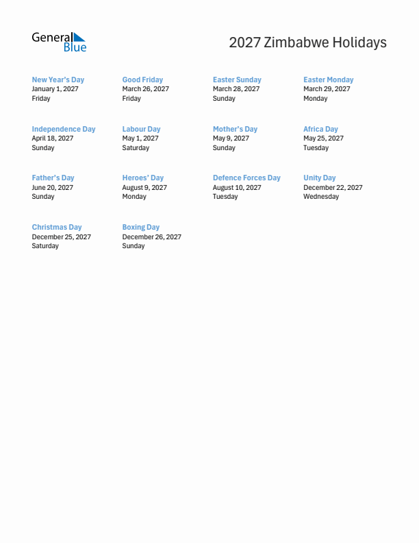 The free printable Zimbabwe 2027 holidays list is available in PDF, Word, or Excel format. The PDF format works best for those who like to print the list of holidays, while the MS Word and Excel holidays list 2027 can be easily modified or customized with notes, size or color changes. Download or print list of holidays now.