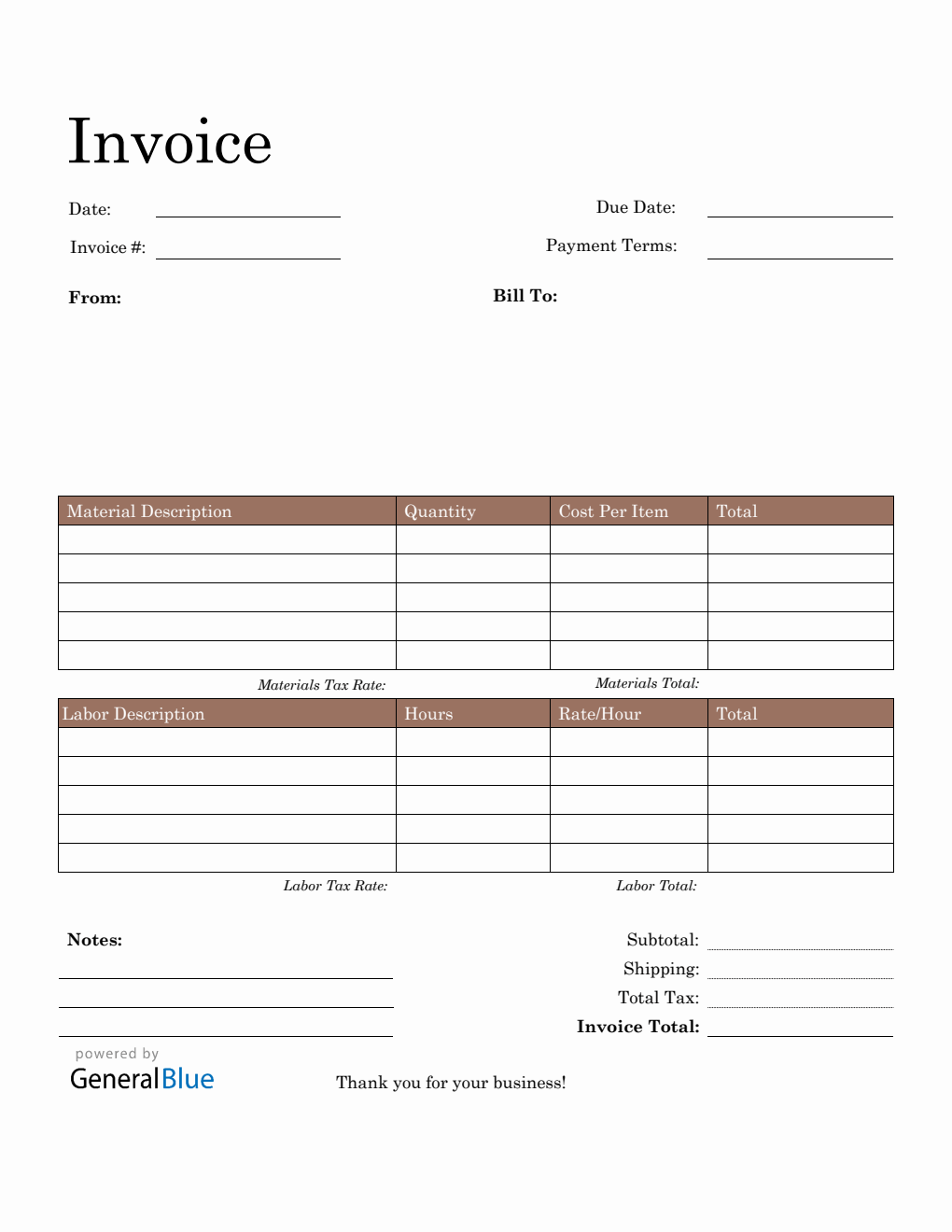 This construction invoice template in PDF can record specific construction materials used as well as the type of labor used to finish a building or project. It can be used by construction companies, electricians, plumbers, and many other contractors. It can be printed or downloaded in Excel format.