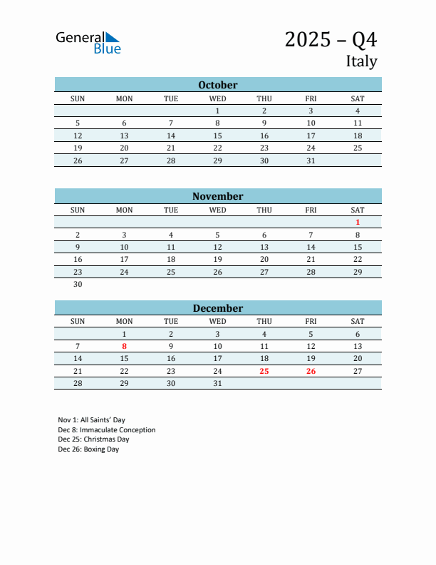 Printable Three Month Calendar with Italy Holidays (Q4 2025)
