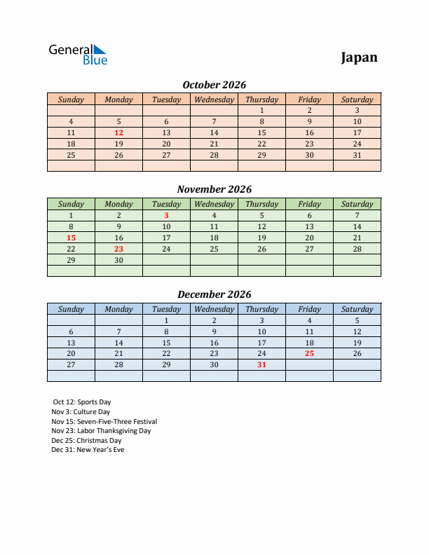 The printable quarterly calendar 2026 with Japan holidays is great for online or offline viewing. Its sleek design gives the calendar a clean and professional look with weekends in red fonts for easier visibility. This Q4 calendar 2026 can be printed or downloaded in PDF, Word, or Excel. This calendar starts on Sunday.