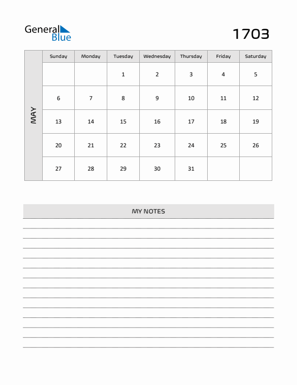 The simple generic calendar for May 1703 with Sunday start allows you to add notes for the entire month. It is a blank printable monthly calendar template with notes section. It works best for those who want to add reminders, tasks, to-do lists, or notes to their month.
