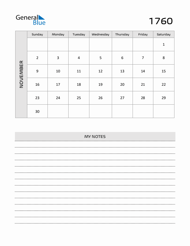 The simple generic calendar for November 1760 with Sunday start allows you to add notes for the entire month. It is a blank printable monthly calendar template with notes section. It works best for those who want to add reminders, tasks, to-do lists, or notes to their month.