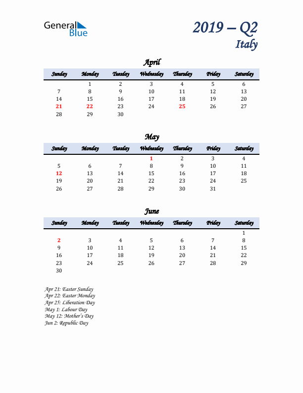 Three-Month Calendar for Italy (Q2 of 2019)