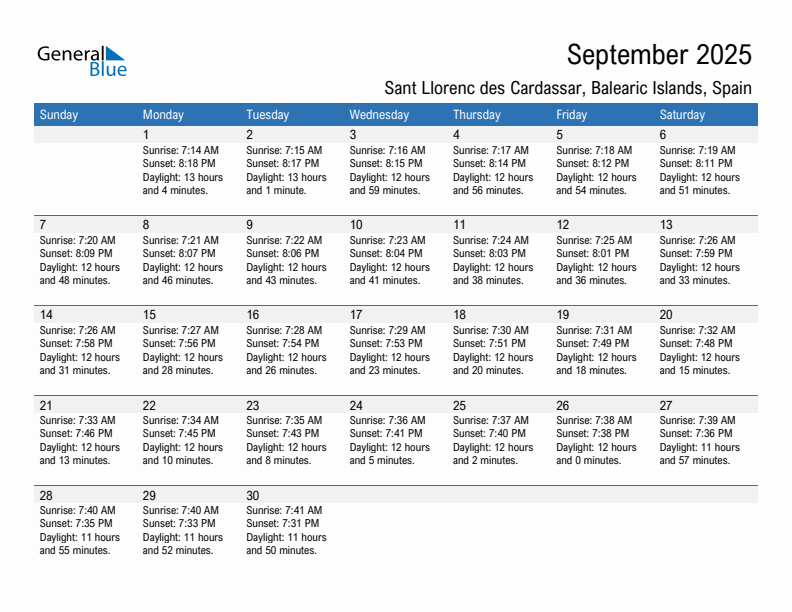About the Sant Llorenc des Cardassar September 2025 Sunrise Sunset Calendar