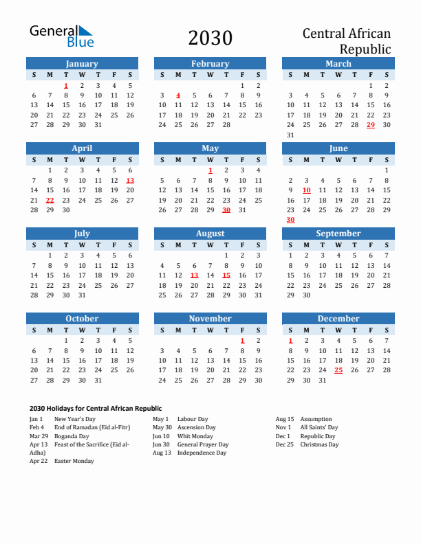 Year 2030 Simple Calendar With Holidays in Central African Republic