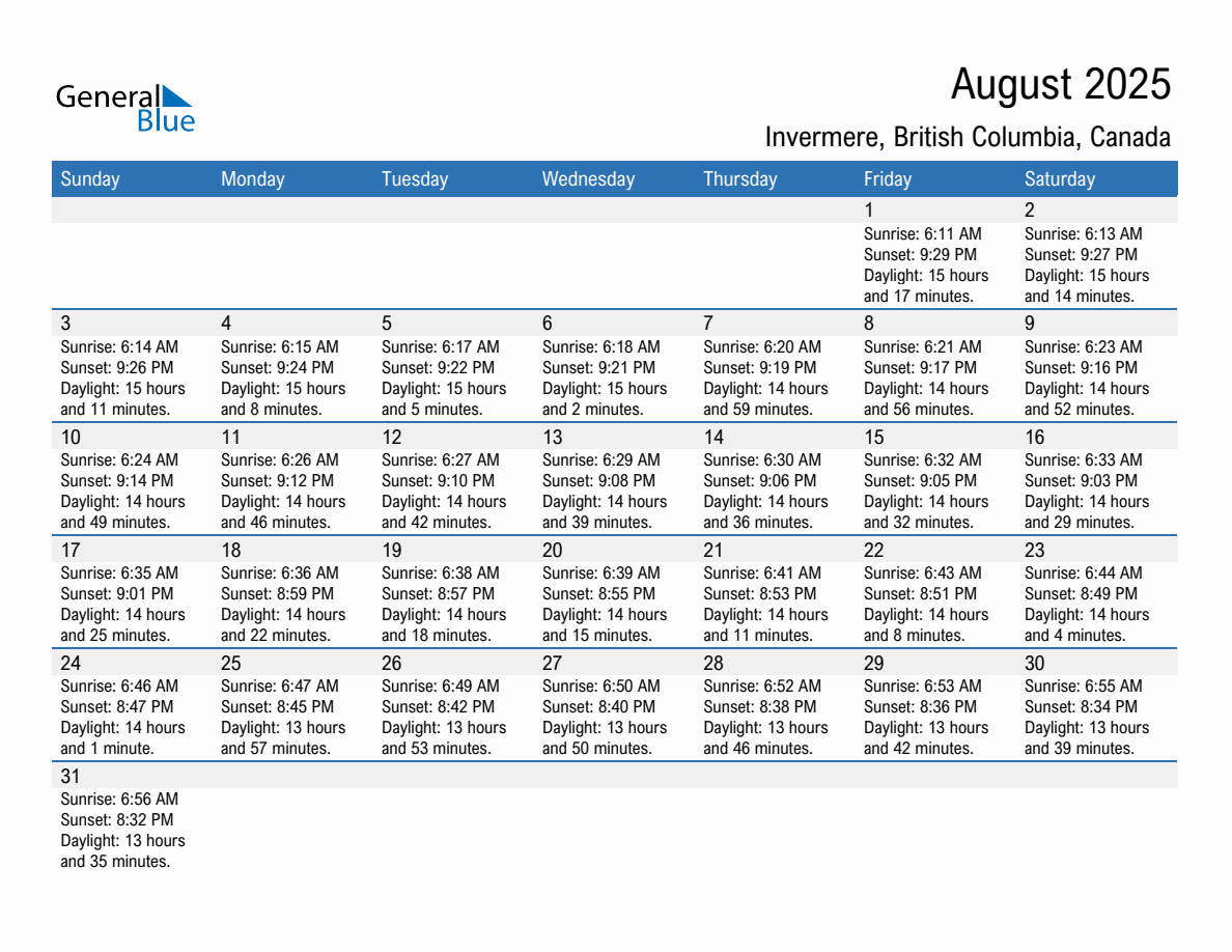 Sunrise and Sunset Times for Invermere