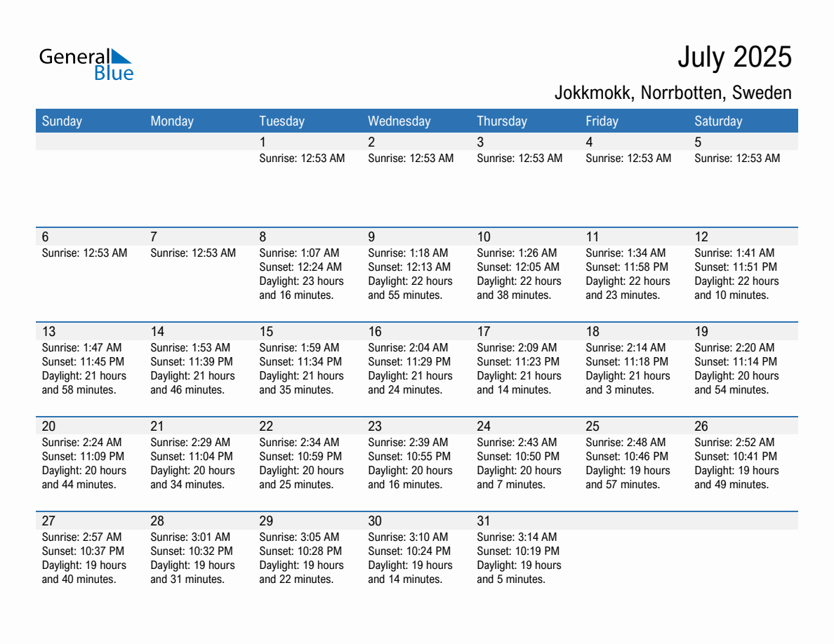 Printable Calendar with Sunrise and Sunset Times in Jokkmokk