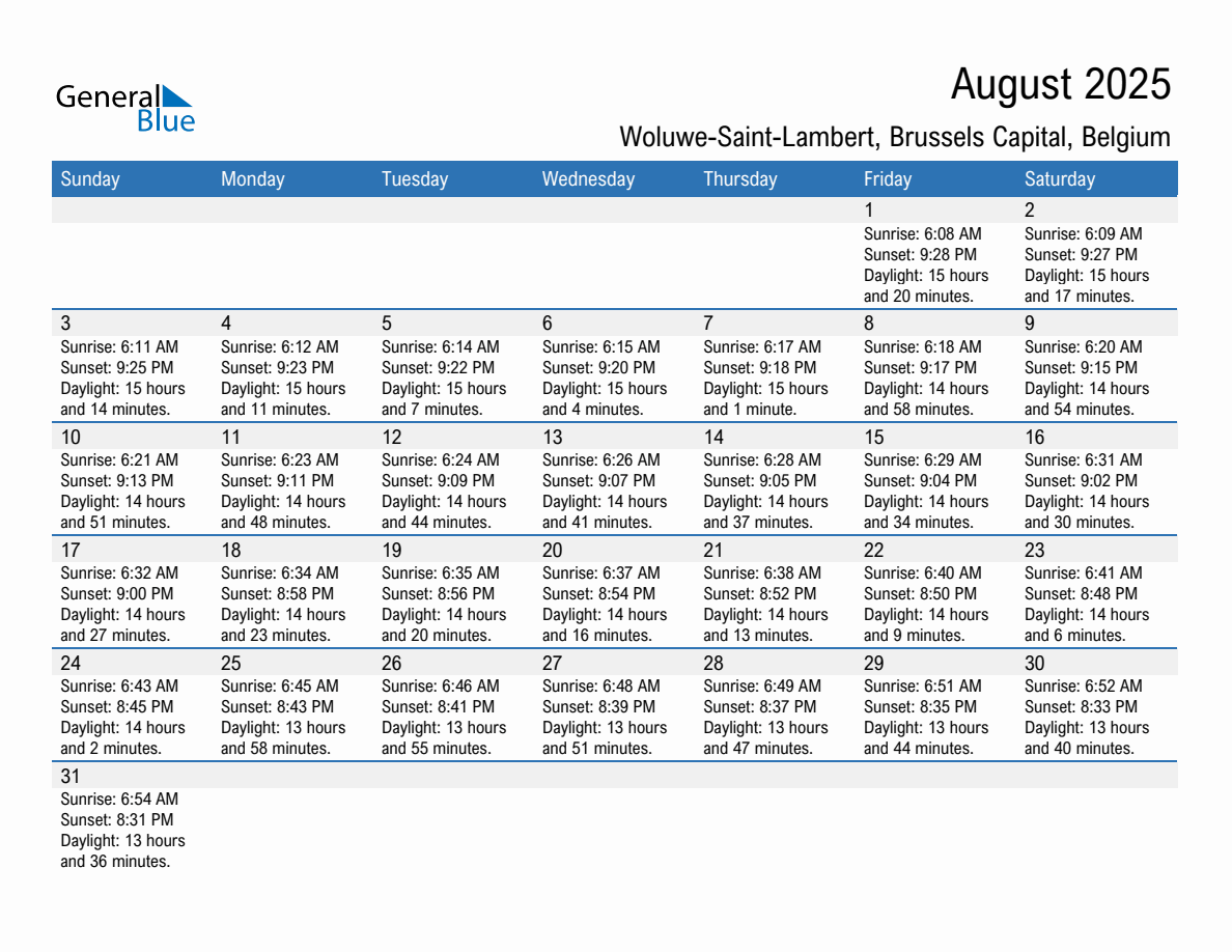 Printable Calendar with Sunrise and Sunset Times in Woluwe-Saint-Lambert