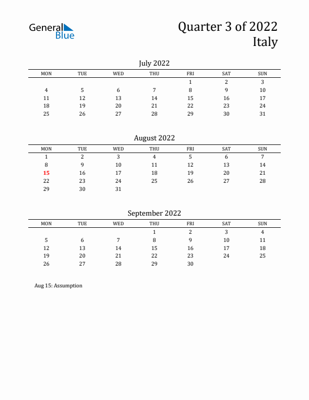 Three-Month Planner for Q3 2022 with Holidays in Italy