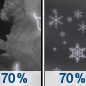 Temperature: 35°F Wind Speed: 5 to 10 mph Wind Direction: SW Forecast: Showers and thunderstorms likely before 1am, then a slight chance of rain and snow showers. Mostly cloudy, with a low around 35. Chance of precipitation is 70%. |