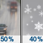 Temperature: 40°F Wind Speed: 5 to 15 mph Wind Direction: WNW Forecast: A chance of rain before 1pm, then a chance of rain and snow between 1pm and 2pm, then a chance of rain and snow. Mostly cloudy. High near 40, with temperatures falling to around 36 in the afternoon. West northwest wind 5 to 15 mph. Chance of precipitation is 50%. |