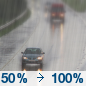 Temperature: 52°F Wind Speed: 7 mph Wind Direction: SW Forecast: Rain. Mostly cloudy. Low around 52, with temperatures rising to around 54 overnight. Southwest wind around 7 mph. Chance of precipitation is 90%. |