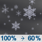 Temperature: 8°F Wind Speed: 3 to 7 mph Wind Direction: NW Forecast: Snow before 2am. Mostly cloudy, with a low around 8. Wind chill values as low as 0. Northwest wind 3 to 7 mph. Chance of precipitation is 100%. New snow accumulation of 2 to 4 inches possible. |