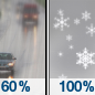 Temperature: 34°F Wind Speed: 10 mph Wind Direction: S Forecast: Rain and snow likely. Cloudy, with a low around 34. Chance of precipitation is 70%. |