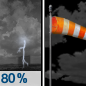 Temperature: 32°F Wind Speed: 12 to 21 mph Wind Direction: W Forecast: Rain and a chance of thunderstorms before 8pm. Partly cloudy, with a low around 32. Chance of precipitation is 80%. |